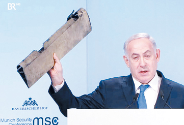 نخستوزیر رژیم صهیونیستی که پیش از این با نمایش یک نقاشی كودكانه در سازمان ملل خود را مضحکه جهانیان کرده بود، این بار در کنفرانس امنیتی مونیخ تکهای آهنپاره را به نمایش گذاشت و مدعی شد که قطعهای از پهپاد ایرانی است كه به سرزمینهای اشغالی نفوذ كرده است. نتانیاهو مدعی شد كه اگر لازم باشد اسرائیل علاوه بر نواب ایران، علیه خود ایران هم اقدام میکند. وزیر خارجه سعودی هم در همسویی با اسرائیل، مدعی شد که مشکلات منطقه با انقلاب ایران آغاز شد.