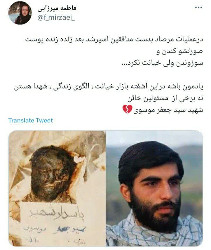 سرویس شبکههای اجتماعی جوان آنلاین: یکی از کاربران در صفحه شخصی خود با تصویری شهید سید جعفر موسوی توئیتی را منتشر کرده است.