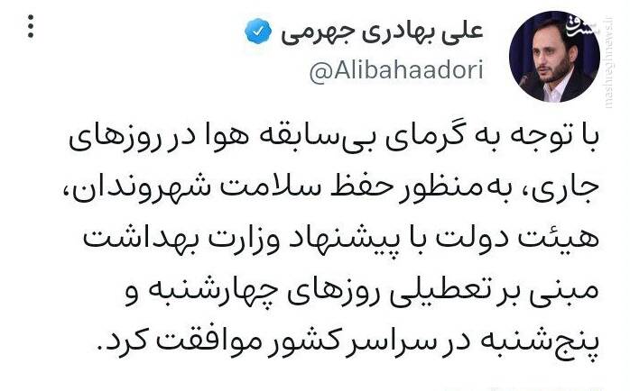 «با توجه به گرمای بیسابقه هوا در روزهای جاری، بهمنظور حفظ سلامت شهروندان، هیئت دولت با پیشنهاد وزارت بهداشت مبنی بر تعطیلی روزهای چهارشنبه و پنجشنبه در سراسر کشور موافقت کرد.»