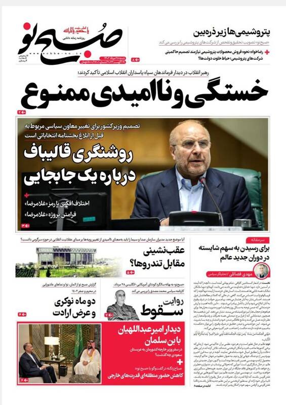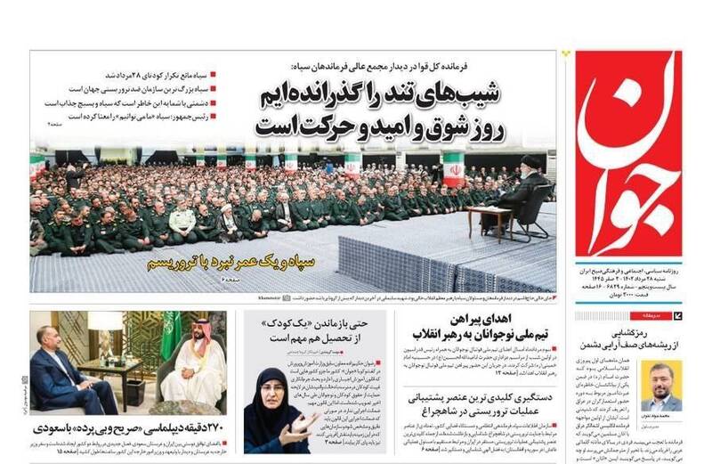 عکس/ صفحه نخست روزنامه‌های شنبه ۲۸ مرداد سپاه و یک عمر نبرد با تروریسم، به قله‌ها نزدیک شده‌ایم، امروز روز امید و حرکت است، در مسیر واقع گرایی، فاز احرایی آشتی، راز جذابیت سپاه و... از جمله موضوعات مورد توجه روزنامه‌های شنبه ۲۸ مرداد است.
