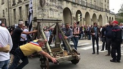 مجموعه این عوامل باعث شد معترضان فراخوانی برای برگزاری تظاهرات در روز شنبه در برابر بخشداری منتشر کنند و به این وسیله درخواستی مبنی بر فعالیت ۲۴ ساعته اورژانس ارائه کنند. فرانسویهایی که طی چندین سال اعتراض به سیاستهای دولت امانوئل ماکرون، رئیسجمهور فرانسه، همواره از پلیس پاسخی توأم با خشونت و طعم گاز اشکآور دریافت کردهاند، این بار برای نمایش اعتراض، با خود منجنیق به همراه داشتند. سلاحی که سابقه کاربرد آن به چندصدسال قبل از میلاد میرسد. این سلاح حتی در قرون وسطی نیز سلاحی فراگیر در جنگها به حساب میآمد. پاسخ پلیس همچون اعتراضهای گذشته دستکمی از مشت آهنین نداشت و نیروهای پلیس اسپری فلفل به سمت معترضان پاشیدند.