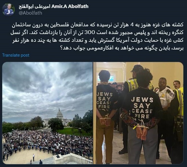 سرویس شبکههای اجتماعی جوان آنلاین: امیرعلی ابوالفتح، فعال رسانه در توئیتی به جواب دادن بایدن در مورد کشتههای غزه اشاره کرده است.