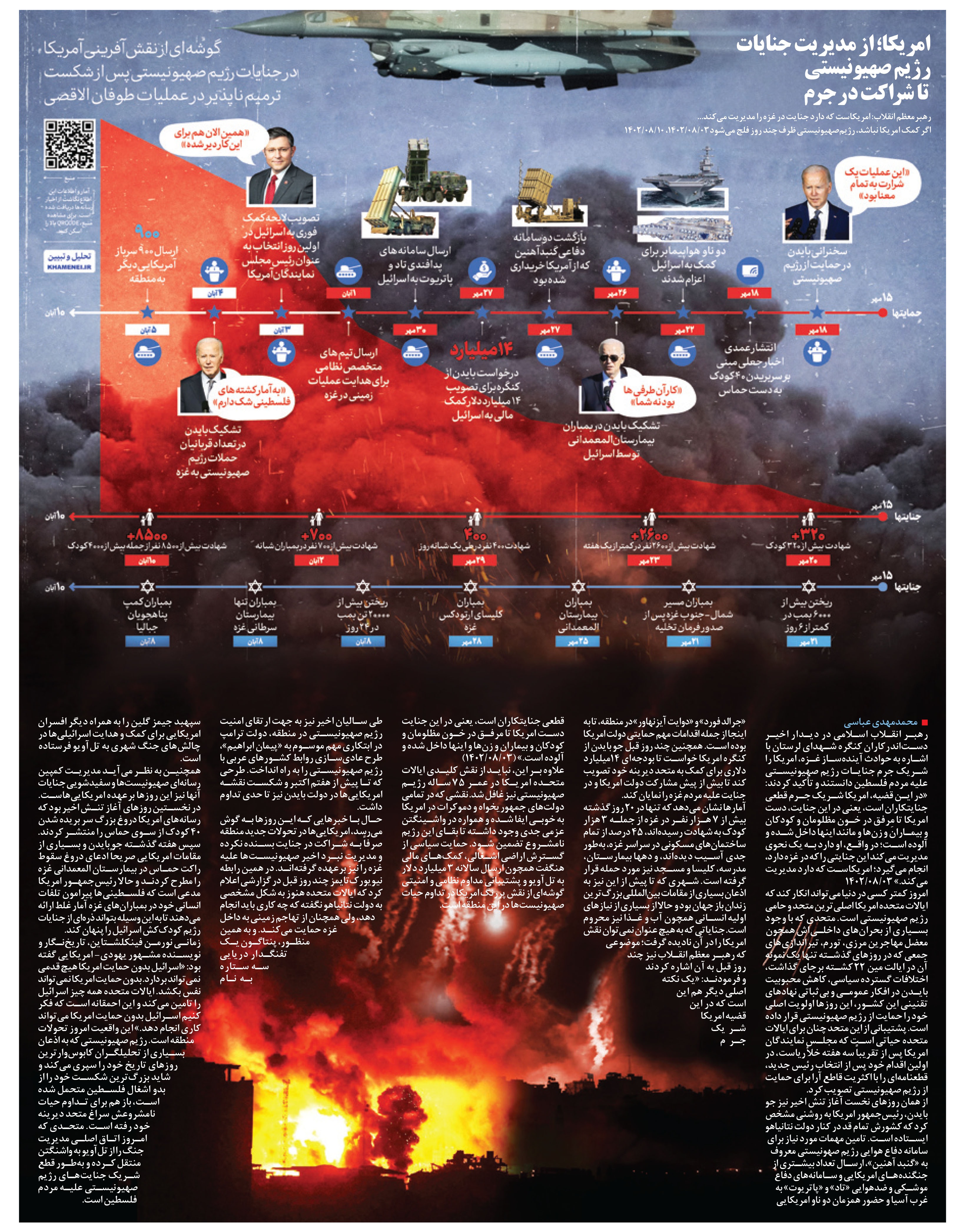 از همان روزهای نخست آغاز تنش اخیر نیز جو بایدن، رئیسجمهور امریکا به روشنی مشخص کرد که کشورش تمام قد در کنار دولت نتانیاهو ایستاده است. تامین مهمات مورد نیاز برای سامانه دفاع هوایی رژیم صهونیستی معروف به «گنبد آهنین»، ارسال تعداد بیشتری از جنگندههای امریکایی و سامانههای دفاع موشکی و ضدهوایی «تاد» و «پاتریوت» به غرب آسیا و حضور همزمان دو ناو امریکایی «جرالد فورد» و «دوایت آیزنهاور» در منطقه، تا به اینجا از جمله اقدامات مهم حمایتی دولت امریکا بوده است. همچنین چند روز قبل جو بایدن از کنگره امریکا خواست تا بودجهای ۱۴میلیارد دلاری برای کمک به متحد دیرینه خود تصویب کند تا بیش از پیش مشارکت دولت امریکا و در جنایت علیه مردم غزه را نمایان کند.