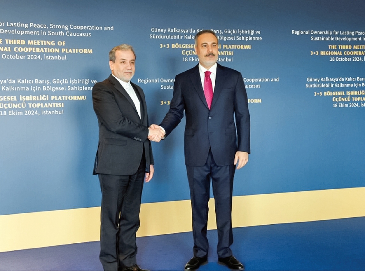 عراقچی از مصر به ترکیه اآمد تا در سازوکار همکاری منطقهای قفقاز موسوم به ۳+۳ در استانبول شرکت کند، ولی این نشست در فضای رایزنیهای ایران با همسایگان خود، در حاشیه قرار گرفت. هاکان فیدان، وزیر امور خارجه ترکیه گفت پیش از ورود عراقچی به کشورش در گفتگو با روزنامه ترکیهای دنیاها هشدار داد که ترکیه و منطقه باید برای جنگ احتمالی بین اسرائیل و ایران آماده باشند، زیرا احتمال درگرفتن آن «بسیار زیاد» است. فیدان البته گفت که کاملاً مخالف چنین جنگی است، و اینکه آنکارا از «هر گونه درگیری با ایران که به جنگ تبدیل شود» حمایت نمیکند، ولی این را هم خاطرنشان کرد که ایران حق دارد در صورت درگیری احتمالی با اسرائیل از خود دفاع کند و تأکید کرد: «البته این حق آنهاست.» عراقچی در بدو ورود به ترکیه گفت با توجه به وضعیتی که در منطقه وجود دارد و تهاجمات رژیم صهیونیستی و شرایط خطرناک منطقه، سفرهایی به منطقه داشتم در دور اخیر نیز پس از اردن و مصر اکنون به ترکیه آمدهام. او گفت: «اکنون درک مشترکی نسبت به خطر درگیریها در غزه و لبنان و وضعیت آوارگان و احتمال گسترش جنگ وجود دارد.» او گفت باید مراقبت کنیم موضوعات منطقهای به طریق مسالمتآمیز حل و فصل شود.