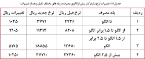 ج) مشترکان تا ۵/۲ برابر الگوی مصرف به ازای هر کیلووات ساعت تا الگوی مصرف قریب ۱۰۳۵ریال و برای مصارف بیش از الگو تا ۵/۱ برابر الگو به ازای هر کیلووات ساعت ۳۱۰۵ریال و برای مصارف بیش از ۵/۱ الگو تا ۵/۲ برابر الگو به ازای هر کیلووات ساعت ۵۱۷۵ریال اضافه خواهد شد.