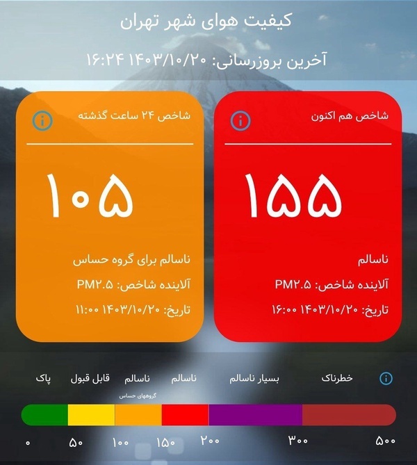 به گزارش فارس، هم‌اکنون شاخص کیفیت هوای پایتخت «ذرات معلق کمتر از ۲.۵میکرون» با میانگین ۱۵۵ در وضعیت ناسالم برای تمامی گروه‌ها قرار دارد. در این وضعیت افراد مبتلا به بیماری قلبی یا ریوی، سالمندان و کودکان باید از فعالیت‌های طولانی یا سنگین خارج ازمنزل خودداری ورزند. افراد دیگر باید فعالیت‌های طولانی یا سنگین خارج از منزل را کاهش دهند.