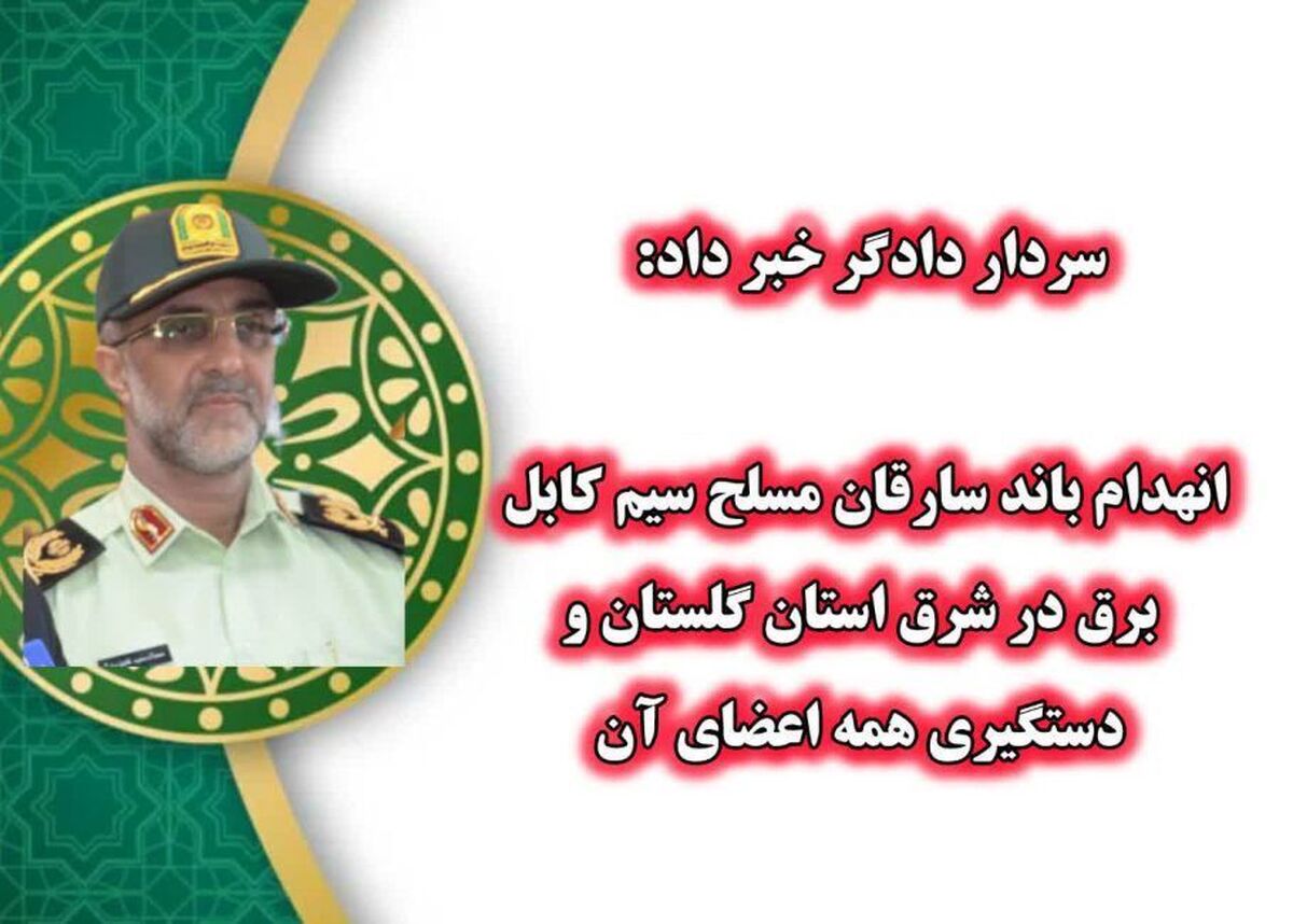 سردار محمد سعید فاضل دادگر فرمانده انتظامی استان گلستان از انهدام باند سارقان مسلح سیم کابل برق و دستگیری هر۴ عضو آن با اشراف اطلاعاتی کاراگاهان پلیس آگاهی خبر داد. به گزارش جوان آنلاین : سردار “محمد سعید فاضل دادگر”فرمانده نیروی انتظامی استان گلستان اظهار داشت: به دنبال وقوع سرقت های مسلحانه سیم کابل برق در شرق استان گلستان ضمن تشکیل قرارگاه ویژه تاکتیکی مبارزه با سرقت های مسلحانه رسیدگی فوری به موضوع در دستور کار قرار گرفت.