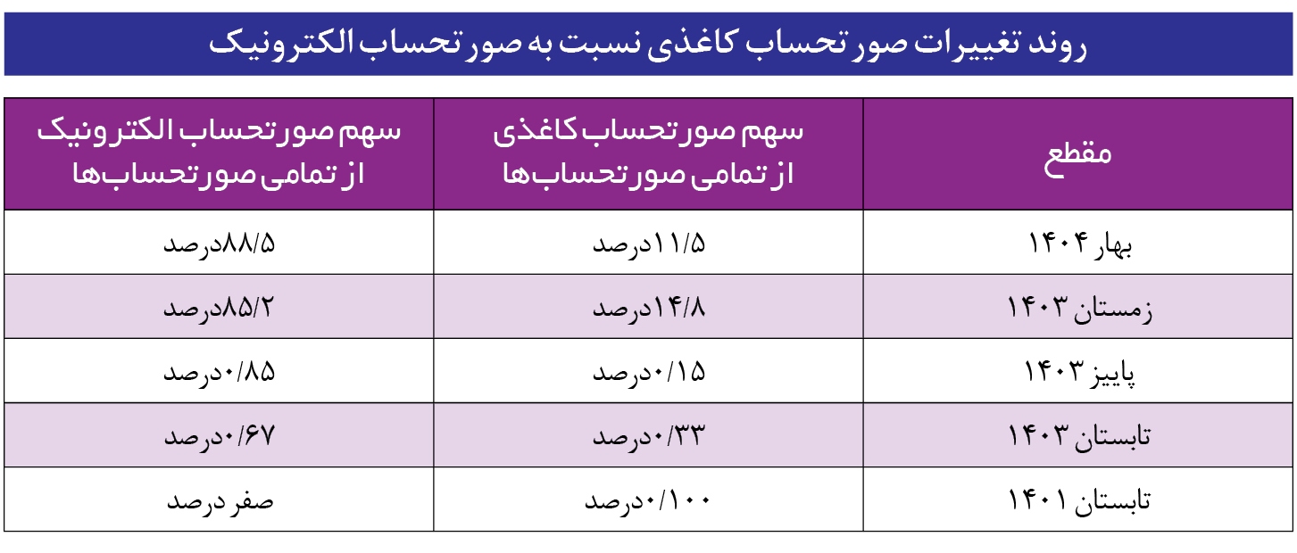 در جدول مقابل روند تغییرات صورتحساب کاغذی نسبت به صورتحساب الکترونیک مشاهده میشود که فرایند هوشمندسازی نظام مالیاتی طی دو سال اخیر مبتنی بر حذف صورتحساب کاغذی از سامانه مؤدیان و حرکت به سمت استقرار صورتحساب الکترونیک به خوبی در حال انجام بوده است و با شیبی ملایم در حال حذف صورتحساب کاغذی و فیزیکی و جایگزین شدن آن با صورتحساب الکترونیک هستیم که به ایجاد مزایای متعددی برای مؤدیان در رفع مشکلات آنها هنگام پرداخت مالیات و همچنین حمایتهای ویژه از مؤدیان قانونمدار و شفاف منجر شده است.