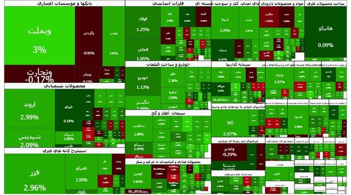 تالار شیشهای در روز سهشنبه همانند اغلب روزهای هفتههای اخیر سبزپوش شد؛ به طوری که شاخص کل بورس با افزایش بیش از ۲۸ هزار واحد به رقم سه میلیون و ۹۳۷ هزار واحد رسید. جوان آنلاین: امروز (سهشنبه) شاخص کل بورس اوراق بهادار تهران ۲۸ هزار و ۶۳ واحد رشد کرد و به رقم سه میلیون و ۹۳۷ هزار و ۱۸۸ واحد رسید. روز گذشته نیز شاخص بازار سرمایه برای اولین بار از کانال ۳.۹ میلیون واحد عبور کرده بود.