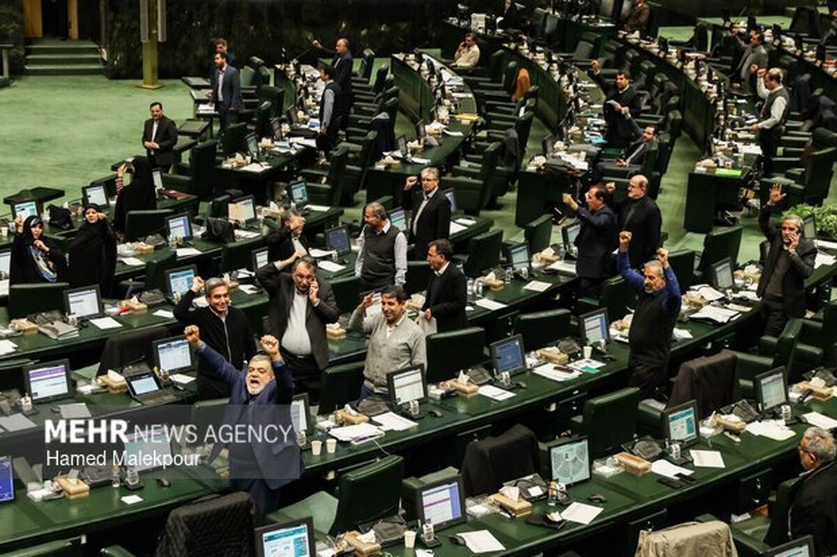 به گزارش مهر، نمایندگان مجلس با مشتهای گرهزده شعارهای «اروپا ننگت باد»، «نهضت ما حسینی، سپاه ما مردمی»، «حسین حسین شعار ماست، شهادت افتخار ماست»، «مرگ بر آمریکا» و «مرگ بر صهیونیست» را سر دادند.همچنین در مقابل جایگاه هیئت رئیسه مجلس شورای اسلامی،