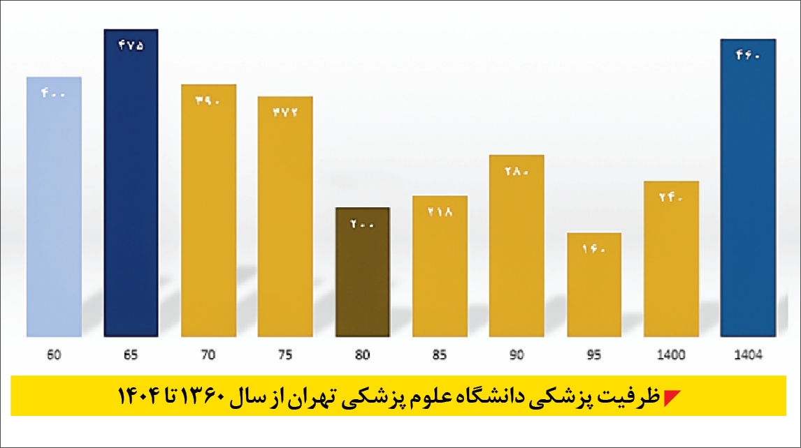 به عنوان یک نمونه شاخص، دانشگاه علوم پزشکی تهران قابل بررسی است: براساس دفترچه انتخاب رشته کنکور تجربی، ظرفیت پزشکی این دانشگاه از سال ۱۳۶۰ تا ۱۳۶۵ سالانه حدود ۴۰۰ نفر بود و در سال ۱۳۶۵ به اوج خود یعنی ۴۷۵ نفر رسید. حال پس از ۳۵ سال روند کاهشی، حتی با وجود فشارهای قانونی برای افزایش ظرفیت، میزان پذیرش این دانشگاه در سال ۱۴۰۴ هنوز به رکورد سال ۱۳۶۵ نرسیدهاست.