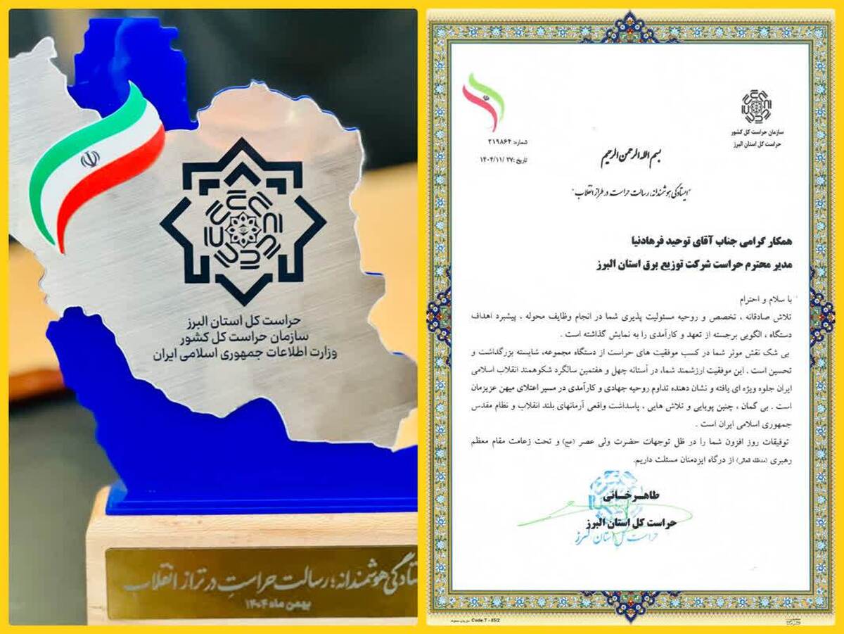 دفتر حراست و امور محرمانه شرکت توزیع نیروی برق استان البرز در ارزیابی حراستهای دستگاههای اجرایی استان البرز در سال ١۴٠۴ عنوان رتبه برتر را به خود اختصاص داد. طی مراسمی به مناسبت هفته گرامیداشت سربازان گمنام امام زمان (عج) ، بر اساس ارزیابیهای تخصصی و پایش عملکرد سالانه دفاتر حراست دستگاههای اجرایی استان البرز ، از سوی حراست کل استان ، دفتر حراست شرکت توزیع برق استان البرز به عنوان حراست برتر نایل گردید و با اهدای تندیس و لوح تقدیر از تلاشها و اقدامات آقای توحید فرهادنیا و همکاران ایشان تجلیل شد.