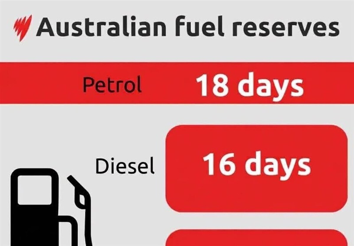 استرالیا فقط ۱۸ روز بنزین، ۱۶ روز گازوئیل و ۱۴ روز سوخت هواپیما دارد وزیر انرژی استرالیا اعلام کرد: فقط ۱۸ روز بنزین؛ ۱۶ روز گازوئیل و ۱۴ روز سوخت هواپیما داریم.