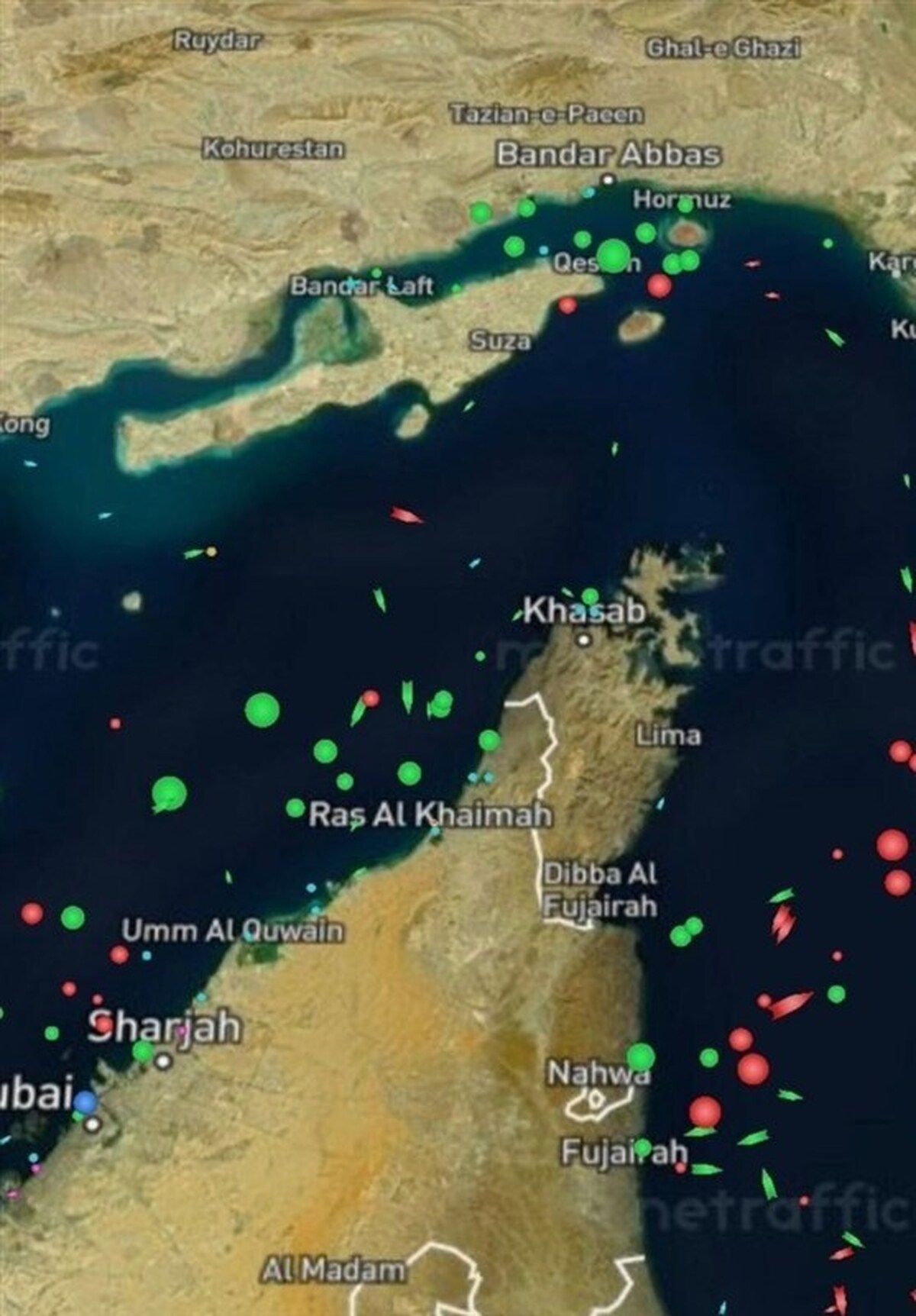 تنگه هرمز همچنان مسدود است براساس تصویر دقایق پیش سایت داده‌های ناوبری دریایی، تنگه هرمز همچنان مسدود است.