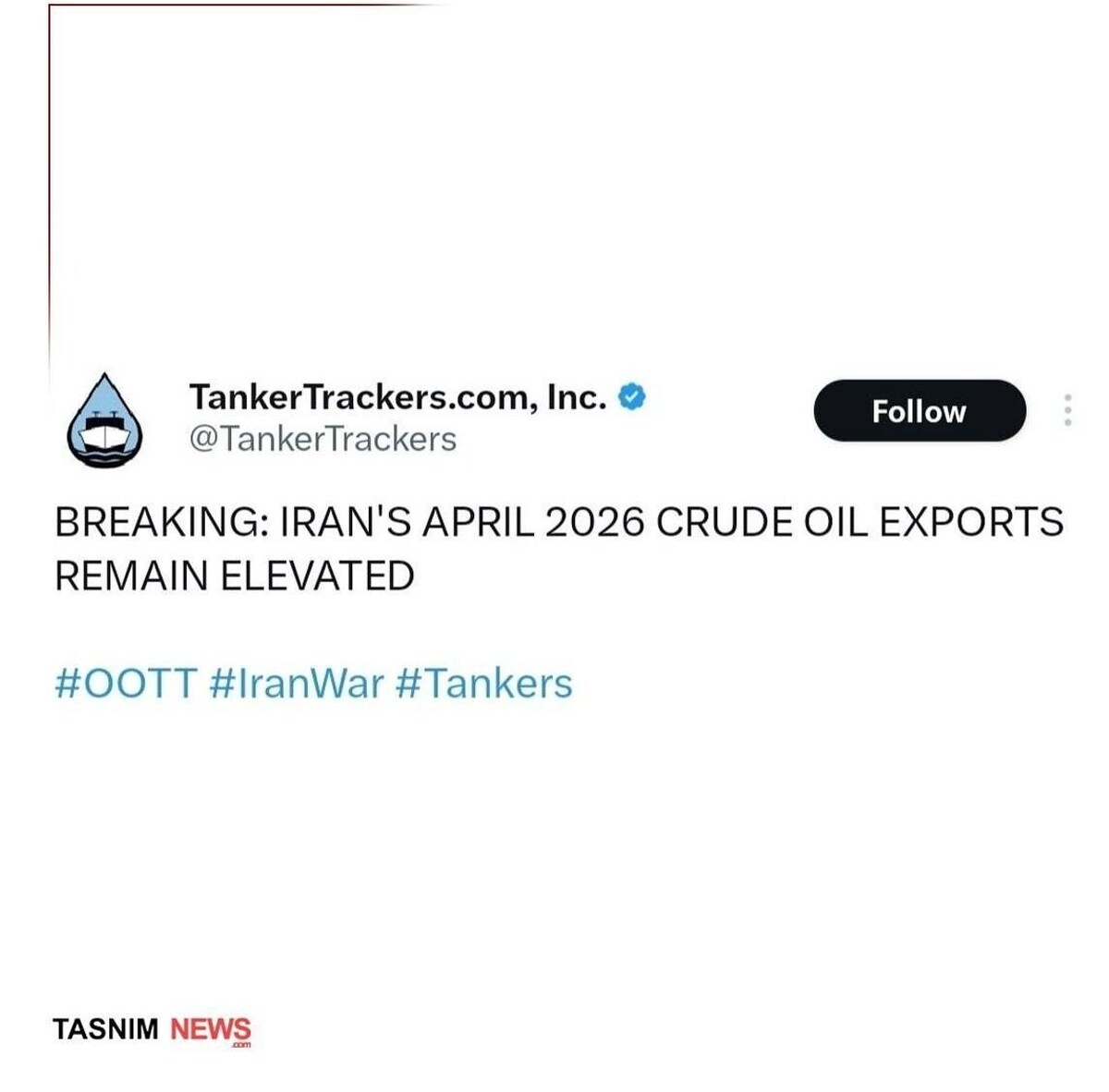 تانکرترکرز:صادرات نفت ایران در ماه آوریل همچنان بالاست. جوان آنلاین: به نقل از تانکر ترکرز، صادرات نفت خام ایران در آوریل ۲۰۲۶ همچنان در سطح بالا باقی مانده است.