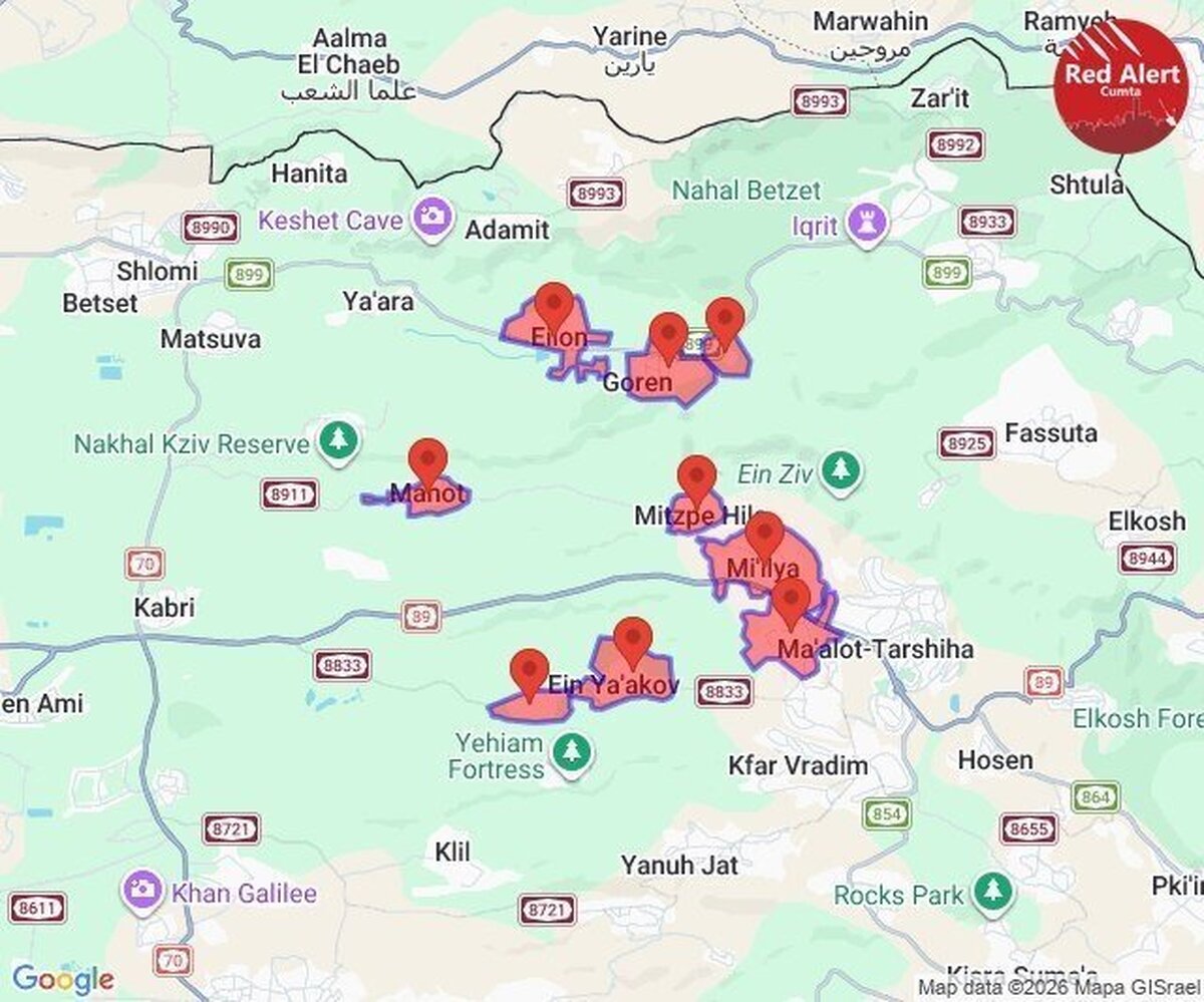 رسانههای عبری از فعال شدن آژیرهای هشدار در مانوت و ایلون، عین یعقوب و جعتون در جلیل الغربی پس از رصد شلیک پهپادها خبر دادند.