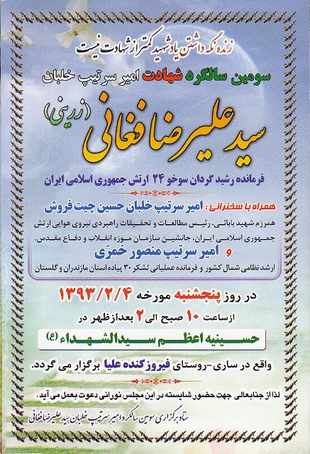 به گزارش خبرنگار جوان از مازندران،مراسم سومین سالگرد شهادت امیر سرتیپ خلبان سید علیرضا فغانی زرینی فرمانده گردان سوخو 24 ارتش جمهوری اسلامی ایران برگزار می شود.