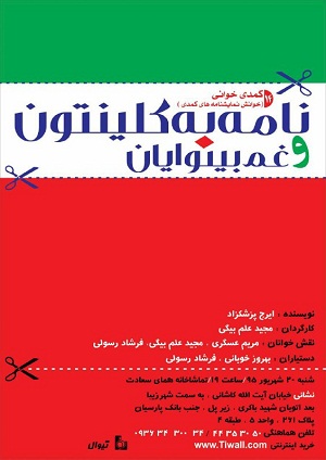 نمایشنامه کمدی «نامه به کلینتون» و «غم بینوایان» به قلم ایرج پاکزاد شنبه از ساعت 19 در همای سعادت تنها تماشاخانه استاندارد غرب تهران خوانده میشوند.