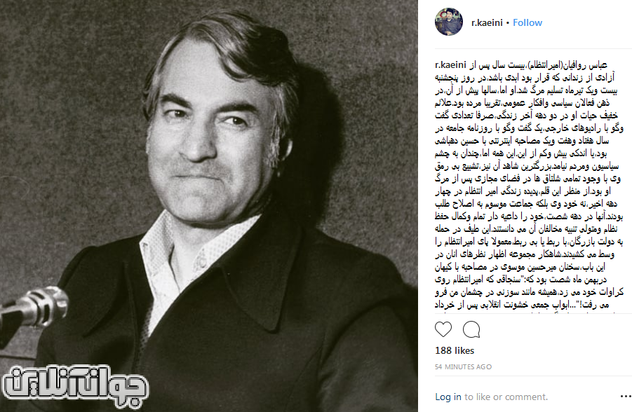 به گزارش سرویس فضای مجازی جوان آنلاین، محمد رضا کائینی، دبیر سرویس تاریخ روزنامه جوان، در صفحه اینستاگرام خود در خصوص عباس امیرانتظام نوشت: عباس روافیان(امیرانتظام)، بیست سال پس از آزادی از زندانی که قرار بود ابدی باشد، در روز پنجشنبه بیست و یک تیر ماه تسلیم مرگ شد. او اما، سالها پیش از آن، در ذهن فعالان سیاسی و افکار عمومی، تقریبا مرده بود. علائم خفیف حیات او در دو دهه آخر زندگی، صرفا تعدادی گفت و گو با رادیوهای خارجی، یک گفت و گو با روزنامه جامعه در سال هفتاد و هفت و یک مصاحبه اینترنتی با حسین دهباشی بود، یا اندکی بیش و کم از این.
