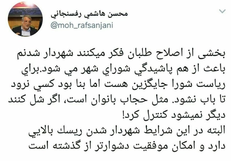 در شرایطی که بارها و بارها نام محسن هاشمی رفسنجانی به عنوان گزینه شهردار تهران مطرح شد، اما هر بار با مخالفت اعضای شورای شهر تهران این موضوع منتفی میشود. اما بعد از تغییرات مکرر در شهرداری تهران، اینبار اعضای شورای شهر تهران تمایل به حضور محسن هاشمی رفسنجانی به عنوان شهردار پایتخت دارند؛ در همین رابطه محسن هاشمی رفسنجانی رئیس شورای شهر تهران روز گذشته در صفحه شخصی توئیتر خود متن زیر را نوشت: «بخشی از اصلاح طلبان فکر میکنند شهردار شدنم باعث از هم پاشیدگی شورای شهر میشود. برای ریاست شورا جایگزین هست، اما بنا بود کسی نرود تا باب نشود. مثل حجاب بانوان است، اگر شل کنند دیگر نمیشود کنترل کرد! البته در این شرایط شهردار شدن ریسک بالایی دارد و امکان موفقیت دشوارتر از گذشته است.»