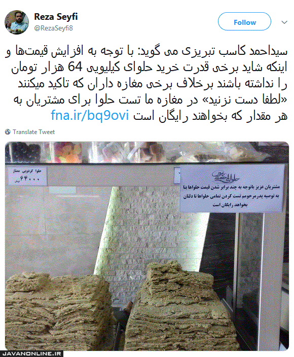 به گزارش جوان آنلاین، «رضا صیفی» از فعالین فضای مجازی با انتشار تصویری از یک حلوا فروشی نوشت: