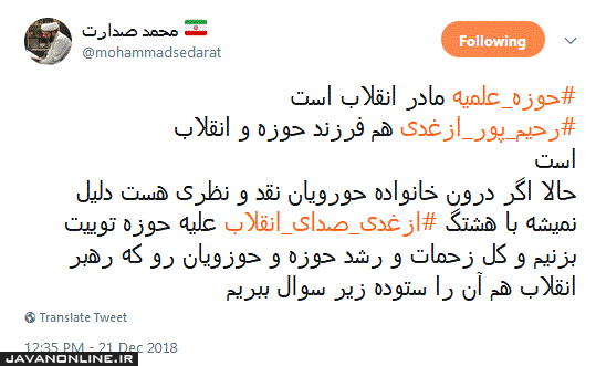 به گزارش جوان آنلاین، محمد صدارت از فعالین فضای مجازی در توئیتر خود در واکنش به دوگانگی‌های شکل گرفته با محوریت استاد رحیم پور ازغدی و حوزه علمیه نوشت: