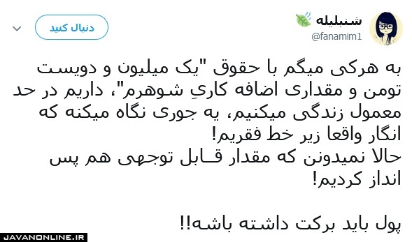 به گزارش جوان آنلاین، یکی از کاربران توئیتر با نام شنبلیله در صفحه خود نوشت: «به هرکی میگم با حقوق "یک میلیون و دویست تومن و مقداری اضافه کاریِ شوهرم"، داریم در حد معمول زندگی میکنیم، یه جوری نگاه میکنه که انگار واقعا زیر خط فقریم! حالا نمیدونن که مقدار قــابل توجهی هم پس انداز کردیم! پول باید برکت داشته باشه!!»