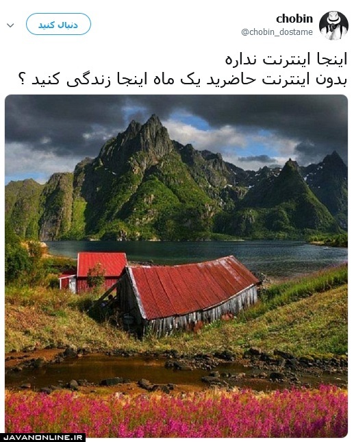به گزارش جوان آنلاین، یکی از کاربران توئیتر با نام چوبین در صفحه خود عکس زیر را منتشر کرد و نوشت:‌ «اینجا اینترنت نداره بدون اینترنت حاضرید یک ماه اینجا زندگی کنید؟»