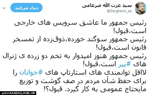 به گزارش جوان آنلاین، سید عزت الله ضرغامی در صفحه توئیتر خود نوشت:‌ «رئیس جمهور ما عاشق سرویس های خارجی است،قبول! رئیس جمهور سوگند خورده،ذوق‌زده از تمسخر قانون است،قبول! رئیس جمهور هنوز امیدوار به تخم دو زرده ی ژنرال های #پیر است،قبول! لااقل توانمندی های استارتاپ های #جوانان را برای حفظ شأن مردم در صف گوشت و توزیع مایحتاج عمومی به کار گیرد. قبول؟!»