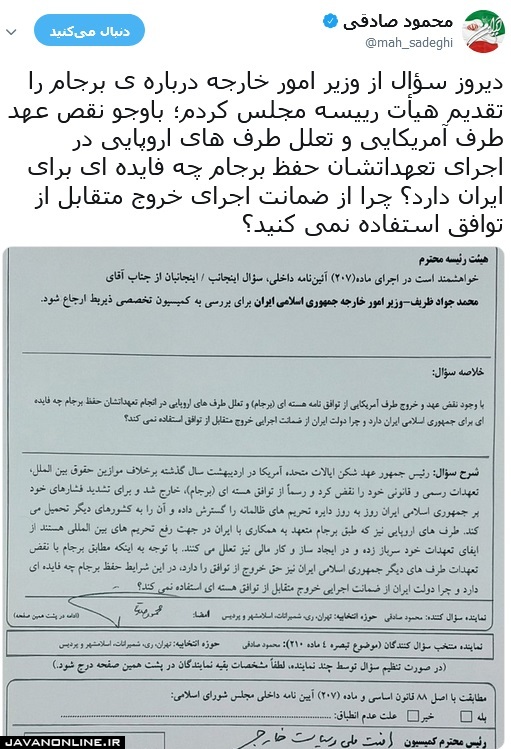 جوان آنلاین: محمود صادقی، نماینده مردم تهران در مجلس در صفحه توئیتر خود عکس زیر را منتشر کرد و نوشت: «دیروز سؤال از وزیر امور خارجه درباره برجام را تقدیم هیأت رییسه مجلس کردم؛ با وجود نقص عهد طرف آمریکایی و تعلل طرفهای اروپایی در اجرای تعهداتشان حفظ برجام چه فایدهای برای ایران دارد؟ چرا از ضمانت اجرای خروج متقابل از توافق استفاده نمیکنید؟»