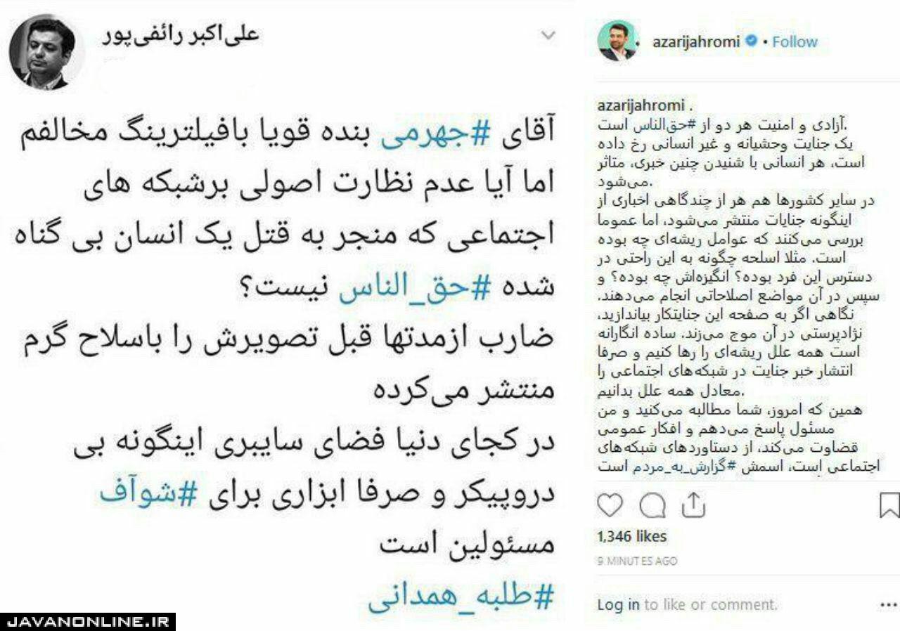 به گزارش جوان آنلاین، محمدجواد آذری جهرمی در واکنش به قتل طلبه همدانی عکس یک توئیت را در صفحه خود در اینستاگرام منتشر کرد و نوشت: «-آزادی و امنیت هر دو از حقالناس است