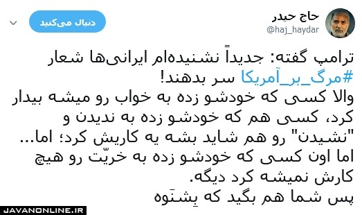 به گزارش جوان آنلاین، یکی از کاربران توئیتر با نام حاج حیدر در صفحه خود نوشت: «ترامپ گفته: جدیداً نشنیدهام ایرانیها شعار مرگ بر آمریکا سر بدهند! والا کسی که خودشو زده به خواب رو میشه بیدار کرد، کسی هم که خودشو زده به ندیدن و "نشیدن" رو هم شاید بشه یه کاریش کرد؛ اما...، اما اون کسی که خودشو زده به خریّت رو هیچ کارش نمیشه کرد دیگه. پس شما هم بگید که بِشنَوه»