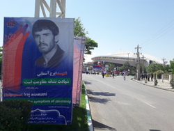 مهدیزاده با اشاره به اینکه یکی از تصاویر نصبشده شهدا را مربوط به یکی از شهدای ورزشکار تازه تفحص شده مدافع حرم است، به معرفی این شهید میپردازد: «شهید آقایی یکی از شهدای ورزشکار مدافع حرم است که رزمی کار بودند. پیکر مبارک این شهید پس از دو سال که در خاک سوریه بود، سهشنبه آینده به کشور برمیگردد و روی دوش مردم ولایی اردبیل تشییع میشود.»