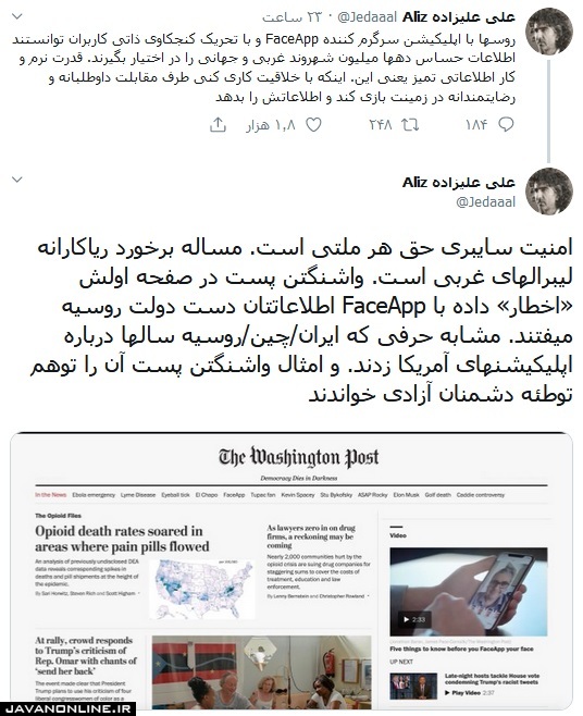 امنیت سایبری حق هر ملتی است. مساله برخورد ریاکارانه لیبرالهای غربی است. واشنگتن پست در صفحه اولش «اخطار» داده با FaceApp اطلاعاتتان دست دولت روسیه میفتند. مشابه حرفی که ایران/چین/روسیه سالها درباره اپلیکیشنهای آمریکا زدند؛ و امثال واشنگتن پست آن را توهم توطئه دشمنان آزادی خواندند.»