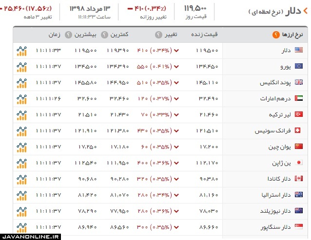 سرویس اقتصادی جوان آنلاین: صبح امروز (یکشنبه ۱۳ مرداد ۹۸)، صرافی‌ها قیمت دلار را ۱۱ هزار و ۹۵۰ تومان اعلام کرده‌اند.همچنین قیمت یورو ۱۳ هزار و ۴۴۵ تومان است.در ادامه قیمت دلار و قیمت سایر ارز‌ها برای روز یکشنبه ۱۳ مرداد ۹۸ را در جدول زیر مشاهده خواهید کرد.