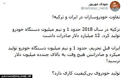 به گزارش جوان آنلاین، مهدی مهرپور سردبیر نود اقتصادی در صفحه توئیتر خود نوشت: «تفاوت خودروسازان در ایران و ترکیه!